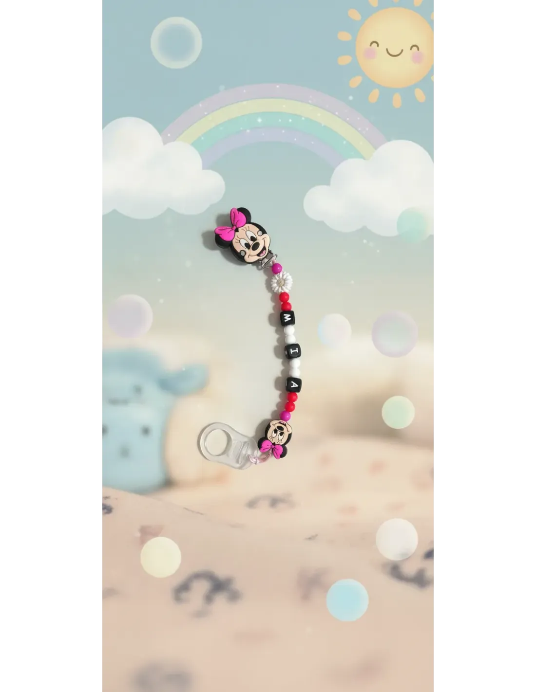 Découvrez ce porte-tétine ultra-mignon inspiré de Minnie, parfait pour les bébés filles fans de magie Disney ! Personnalisez-le avec le prénom de votre petite princesse pour un accessoire unique qui allie style chic noir/rouge, sécurité et praticité quotidienne.